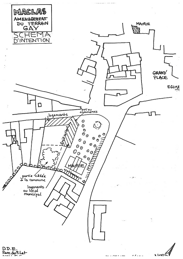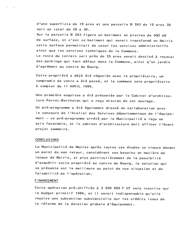 Par suite d’une acquisition faite à la Vve Borrionne, pour l’élargissement du chemin d’intérêt communal N°19 ayant son aboutissement sur la place publique de Maclas. Une partie de l’immeuble acquis est devenu disponible comme emplacement et le conseil municipal a, de suite, pensé à l’utiliser pour la construction de la mairie. On nous a confié la rédaction de ce rapport. Le pourtour de cet emplacement laissant beaucoup à désirer comme régularité, nous avons fait cependant notre possible pour en tirer le meilleur parti, nous nous sommes strictement conformés au programme imposé pour le nombre et la division des appartements.